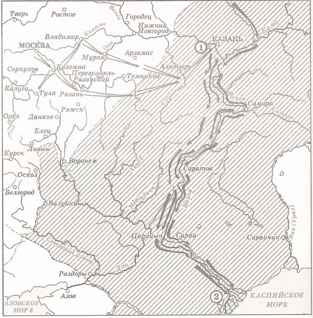 «В июне после тщательной подготовки начался последний поход на Казань. Во главе русской армии, насчитывавшей 150 тыс. чел., находился сам царь. В походе успешно участвовало также недавно учрежденное стрелецкое войско. Мордвины и чуваши служили во вспомогательных отрядах. Первоначально войска из Коломны двинулись к Мурому (царь с 3 полками) и в район Рязани (3 полка во главе с князем И. Ф. Мстиславским и др.). Во 2-й декаде июля к Казани на судах отправилась артиллерия из Нижнего Новгорода. В это же время полки главной армии выступили из Рязани и Мурома. Войско соединилось близ города __________ на берегу реки Суры».