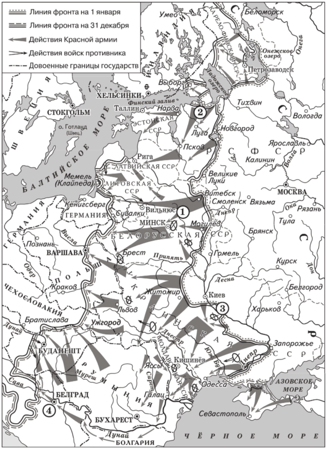 2. В период боевых действий, обозначенных на схеме стрелками, союзники СССР открыли Второй фронт во Франции.