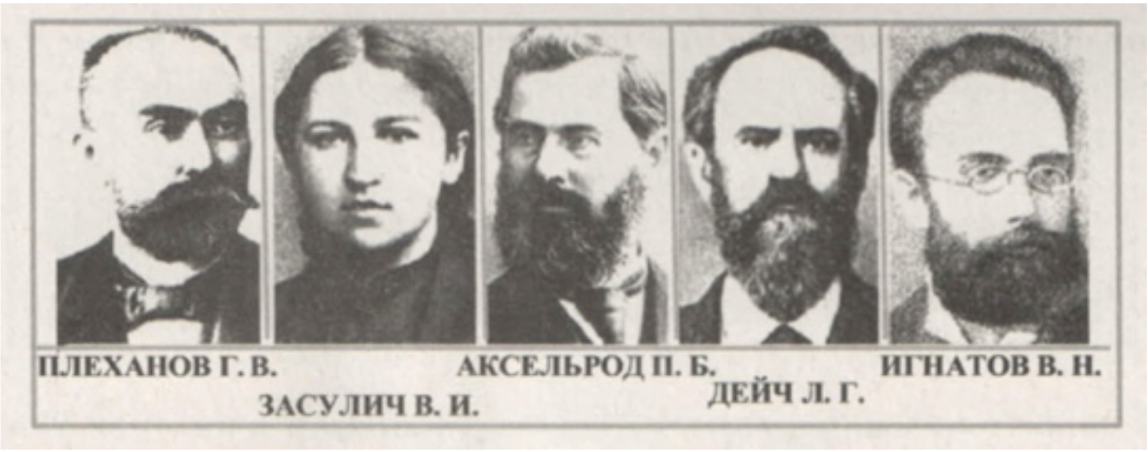 Укажите название организации, созданной группой революционеров, чьи портреты даны на иллюстрации. Используя изображение, укажите революционное учение, к которому принадлежала эта группа.
