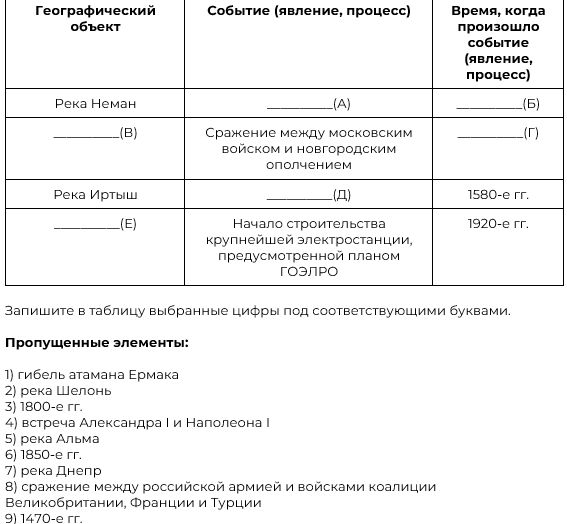 Заполните пустые ячейки таблицы, используя приведённый ниже список пропущенных элементов: для каждого пропуска, обозначенного буквой, выберите номер нужного элемента.