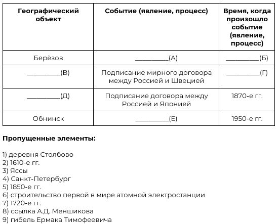 Заполните пустые ячейки таблицы, используя приведённый ниже список пропущенных элементов: для каждого пропуска, обозначенного буквой, выберите номер нужного элемента.