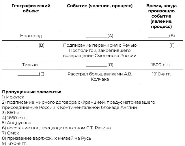 Заполните пустые ячейки таблицы, используя приведённый ниже список пропущенных элементов: для каждого пропуска, обозначенного буквой, выберите номер нужного элемента.