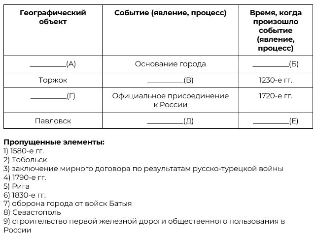 Заполните пустые ячейки таблицы, используя приведённый ниже список пропущенных элементов: для каждого пропуска, обозначенного буквой, выберите номер нужного элемента.