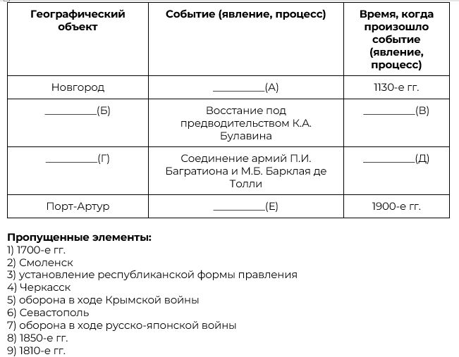 Заполните пустые ячейки таблицы, используя приведённый ниже список пропущенных элементов: для каждого пропуска, обозначенного буквой, выберите номер нужного элемента.