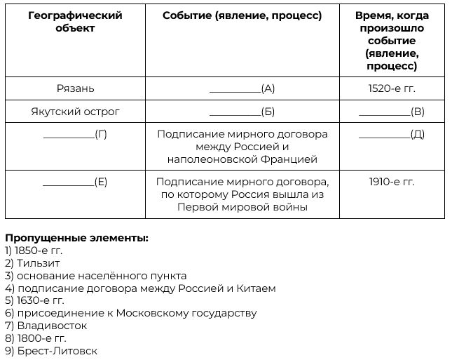 Заполните пустые ячейки таблицы, используя приведённый ниже список пропущенных элементов: для каждого пропуска, обозначенного буквой, выберите номер нужного элемента.