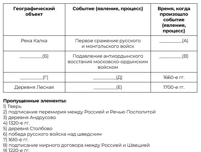 Заполните пустые ячейки таблицы, используя приведённый ниже список пропущенных элементов: для каждого пропуска, обозначенного буквой, выберите номер нужного элемента.