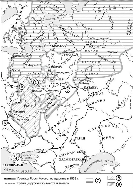«Территория России на тот момент представляла собой внушительную площадь, на границах которой были совершенно разные территории. Так на Востоке было Казанское ханство, на Юге - _________, а на Северо-Западе - королевство Швеция».
