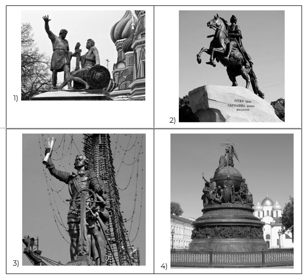 Какой из представленных ниже памятников скульптуры находится в том же городе, что и изображённые на монете архитектурные сооружения? В ответе запишите цифру, которой обозначен этот памятник скульптуры. Назовите монарха, по указу которого был создан этот памятник скульптуры.