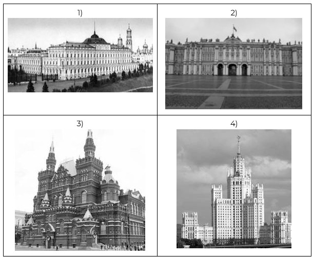 Строительство какого из представленных ниже памятников архитектуры осуществлялось в период руководства СССР того же политического деятеля, при котором была принята указанная на марке Конституция СССР? В ответе запишите цифру, которой обозначен этот памятник архитектуры. Укажите название города, где находится этот памятник архитектуры.