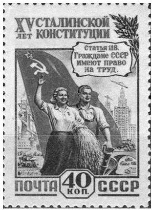 Укажите порядковый номер пятилетнего плана, реализация которого началась в год, когда отмечалась годовщина, указанная на почтовой марке. Используя изображение, приведите одно любое обоснование Вашего ответа.