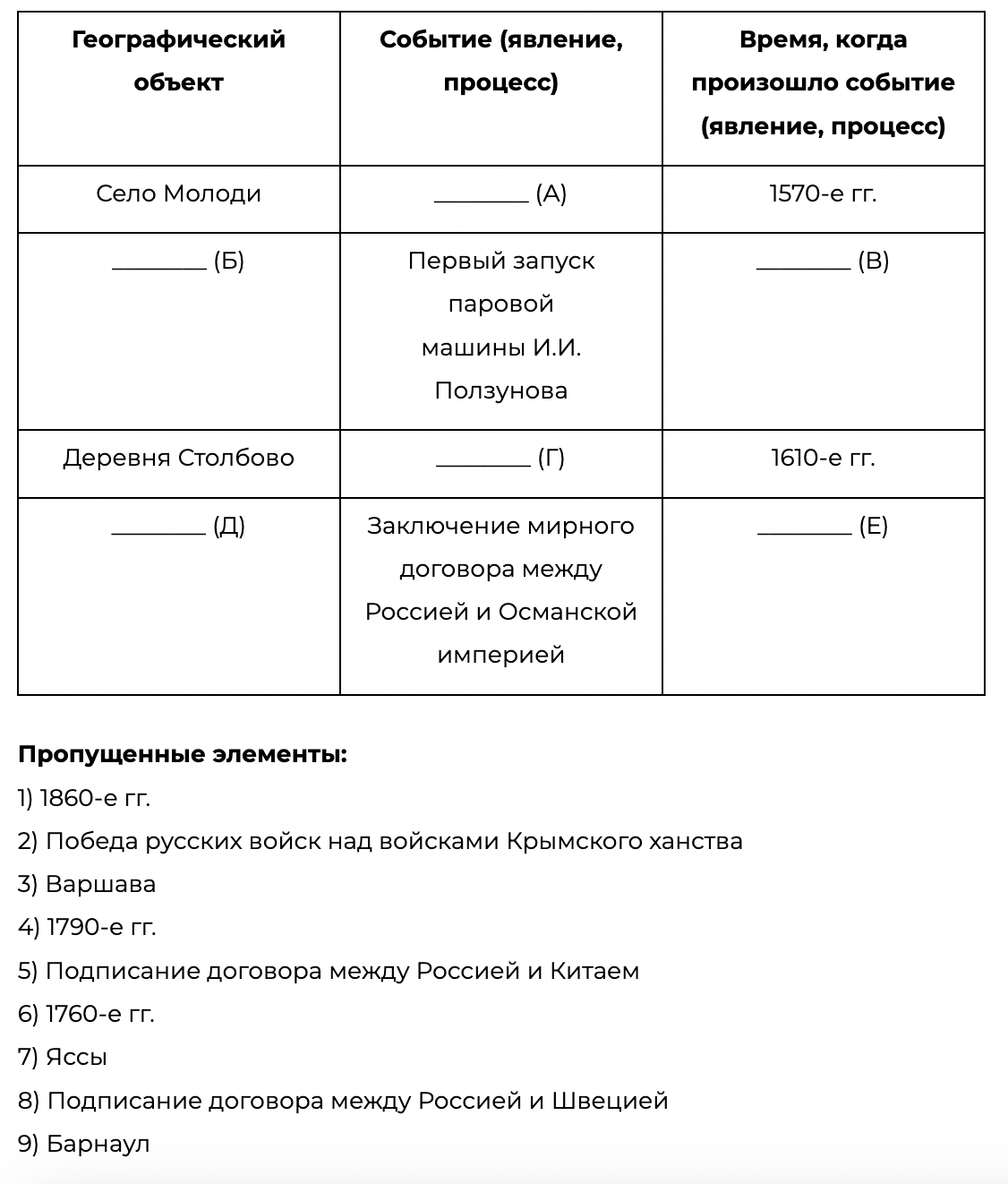 Заполните пустые ячейки таблицы, используя приведённый ниже список пропущенных элементов: для каждого пропуска, обозначенного буквой, выберите номер нужного элемента.