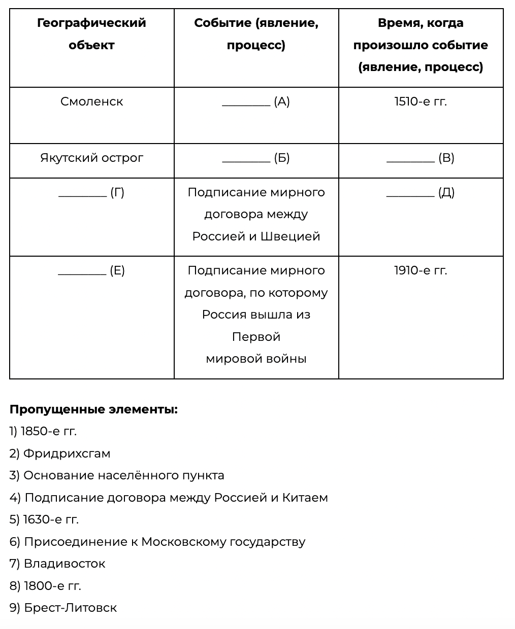 Заполните пустые ячейки таблицы, используя приведённый ниже список пропущенных элементов: для каждого пропуска, обозначенного буквой, выберите номер нужного элемента.