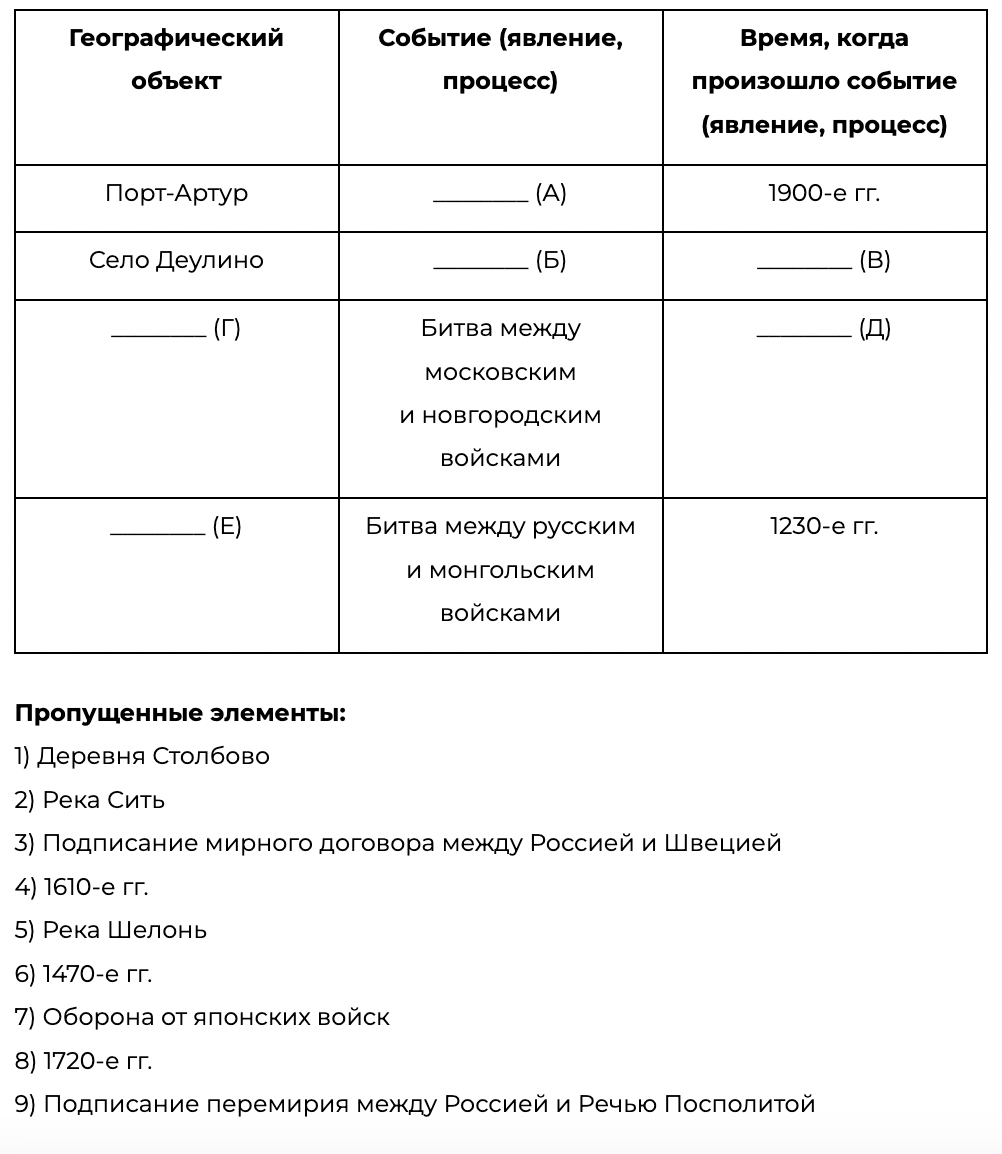 Заполните пустые ячейки таблицы, используя приведённый ниже список пропущенных элементов: для каждого пропуска, обозначенного буквой, выберите номер нужного элемента.