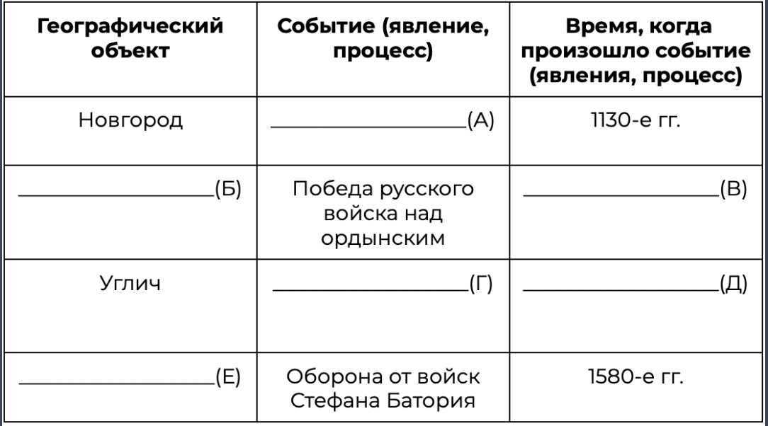 Заполните пустые ячейки таблицы, используя приведённый ниже список пропущенных элементов: для каждого пропуска, обозначенного буквой, выберите номер нужного элемента.
