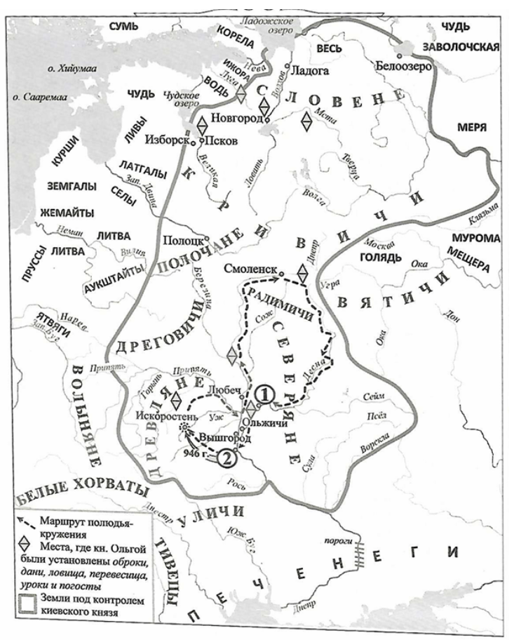 «В год 6454. Ольга с сыном своим Святославом собрала много храбрых воинов и пошла на Деревскую землю. И вышли древляне против неё. И когда сошлись оба войска для схватки… <…> и победили древлян. Древляне же побежали и затворились в своих городах. Ольга же устремилась с сыном своим к городу __________, так как те убили её мужа, и стала с сыном своим около города, а древляне затворились в городе и стойко оборонялись из города, ибо знали, что, убив князя, не на что им надеяться. И стояла Ольга всё лето и не могла взять города…»