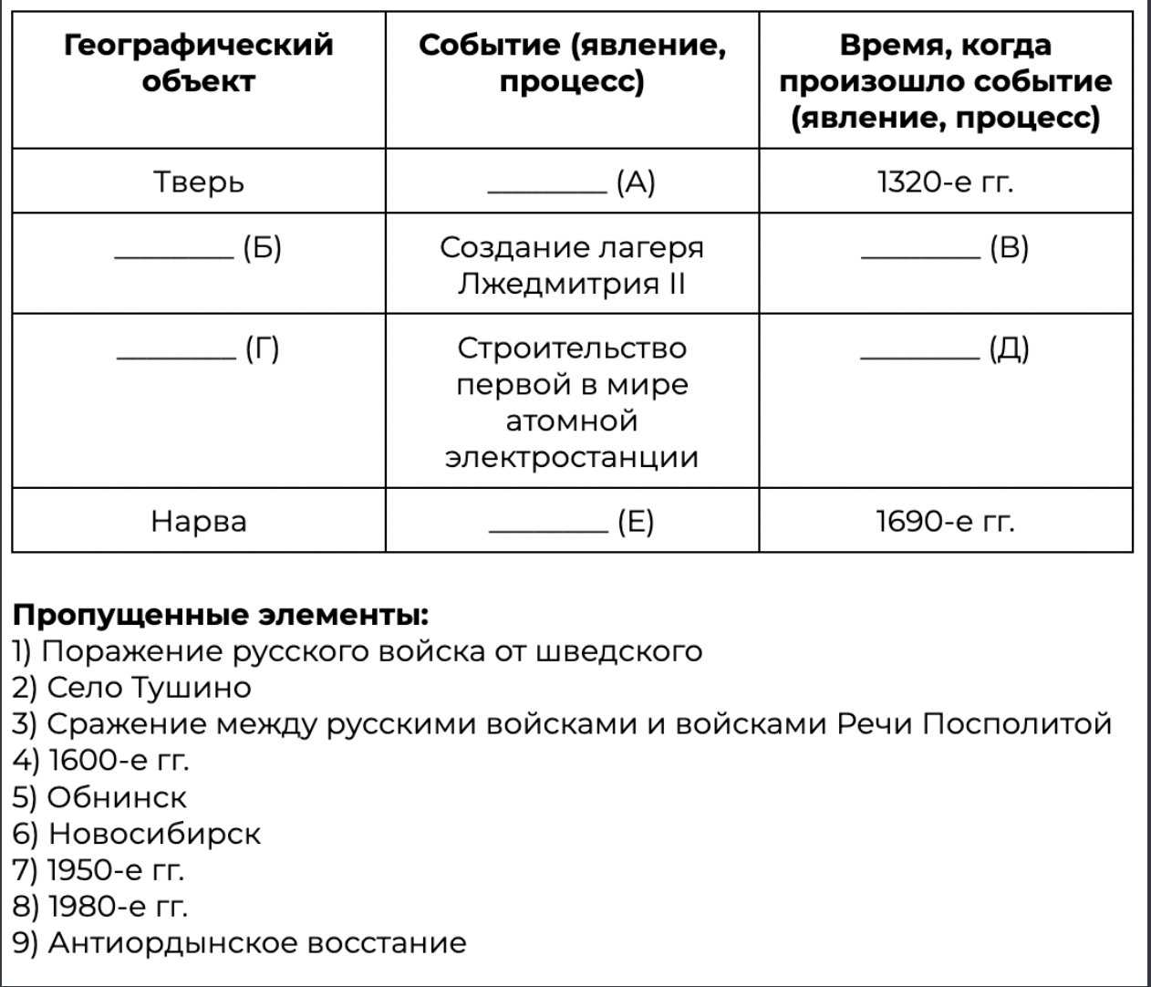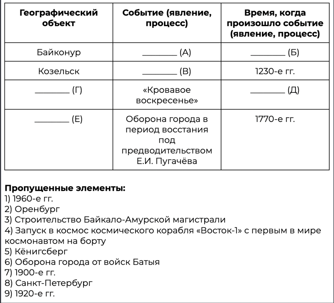 Заполните пустые ячейки таблицы, используя приведённый ниже список пропущенных элементов: для каждого пропуска, обозначенного буквой, выберите номер нужного элемента.