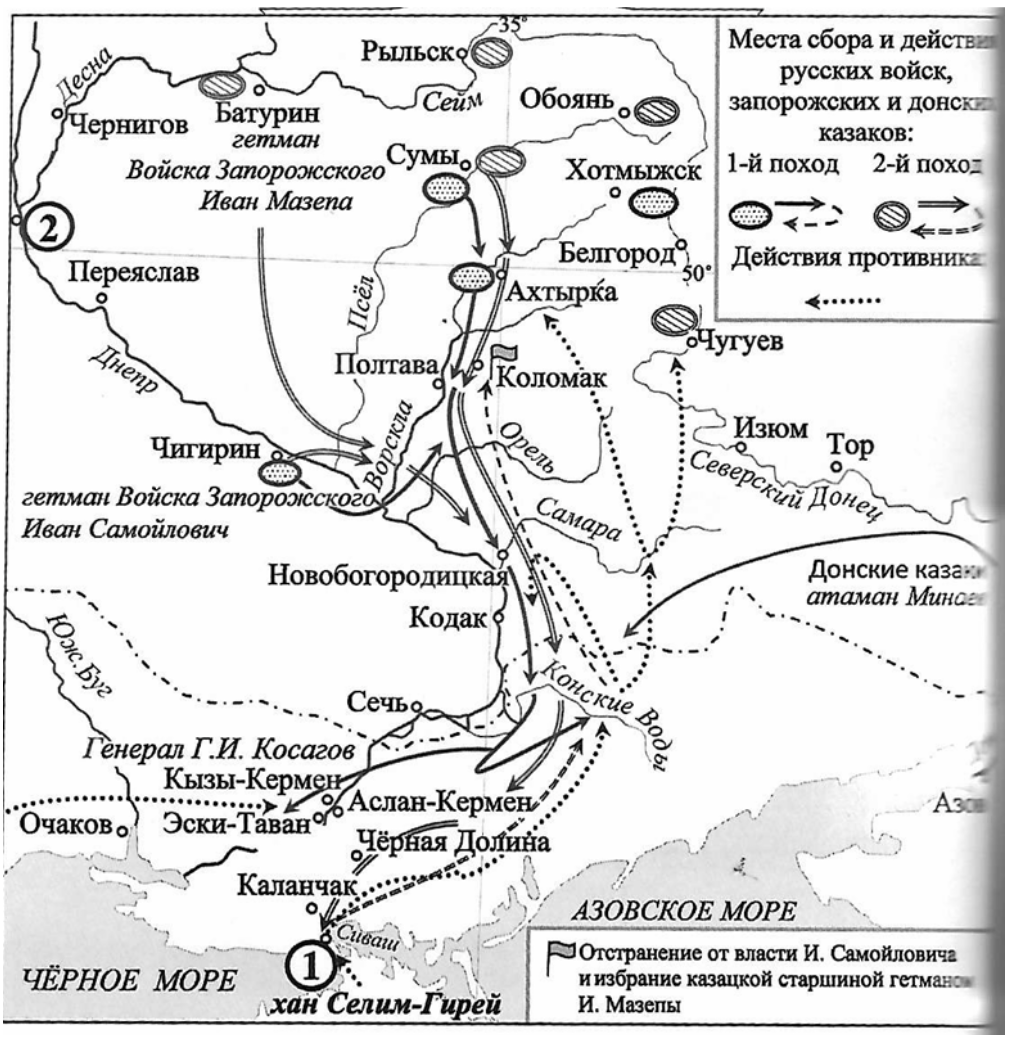 «В. В. Голицын решил повторить поход основных сил русской армии на Крым, исправив по возможности все ошибки Первого крымского похода. В частности, запасы были заранее свезены в приграничную крепость Новобогородицкая на р. __________ и другие ближние места; русская армия собралась в Сумах к началу марта. Гетман И. С. Мазепа шёл на помощь».