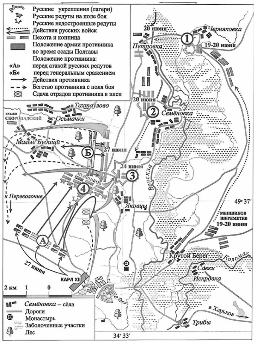 «Сего месяца 20 дня перешла вся наша армия через Ворсклу и по ту сторону оной с малую милю от неприятелской армии стали. Потом же, 24 числа, пошли далее со всею армеею и стали с четверть мили от неприятеля… Наша же кавалерия на правой руке междулесов поставлена была и пред оною несколько редут зделано. И людьми и пушками осажены [редуты снабжены]».