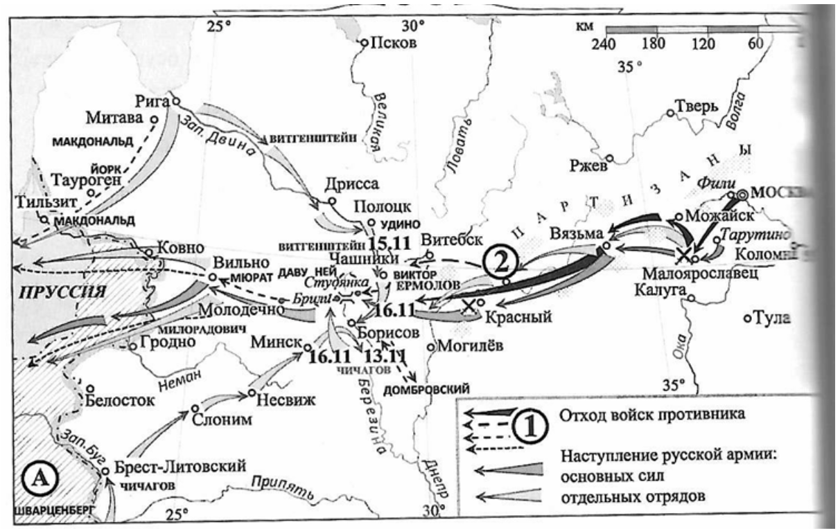 «Выше Борисова по течению [реки] _______, У [реки] Студянки французы построили два моста из разобранных крестьянских изб и 14-16 ноября провели переправу через реку. 15 ноября до полудня, до начала сильных боёв, переправился сам [император]. С обеда 15-го и день 16 ноября французам удалось перевести на правый берег, в окрестности деревни Брили гвардию и другие части. Утром 17-го французы сожгли мосты и двинули на Молодечно».