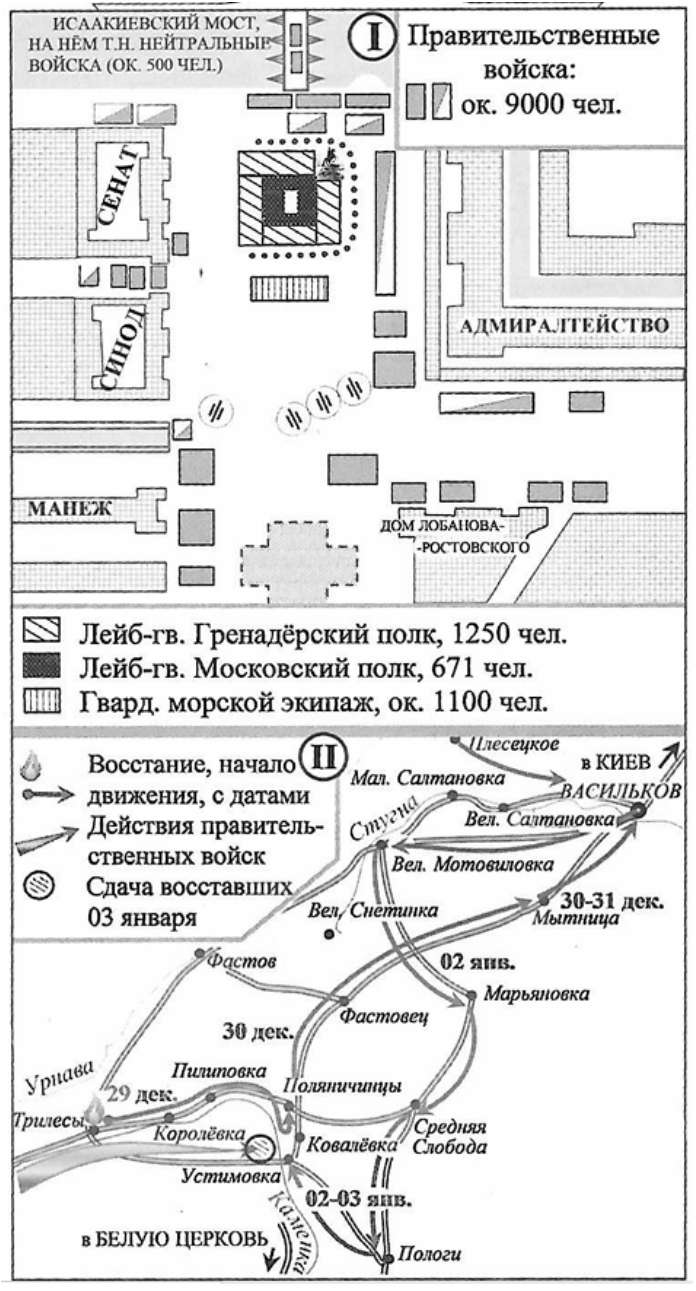 «Между тем доходили до государя императора сведения, что роты бунтовавшие были 5-я и 6-я Московского полка, что они уже вошли на площадь против Сената и что при них находится толпа разных людей в самом буйственном виде. …тогда же прибыл к государю императору военный генерал-губернатор Милорадович с известием, что толпа произносит крик и восклицания ,,ура, Константин!" и что он полагает, что [это] предлог к самым пагубным намерениям, [против] которых нужно без отлагательства взять строжайшие меры».