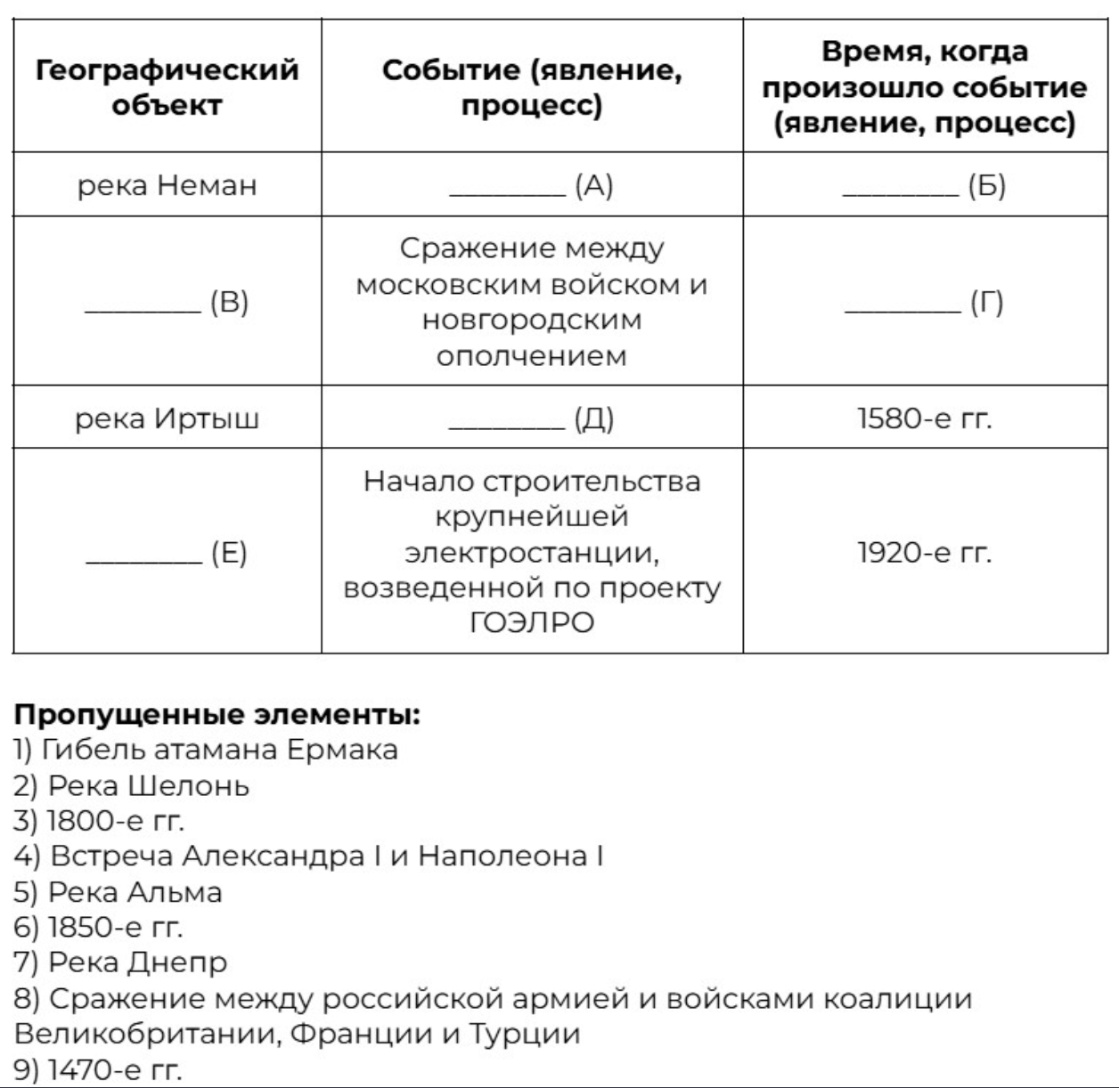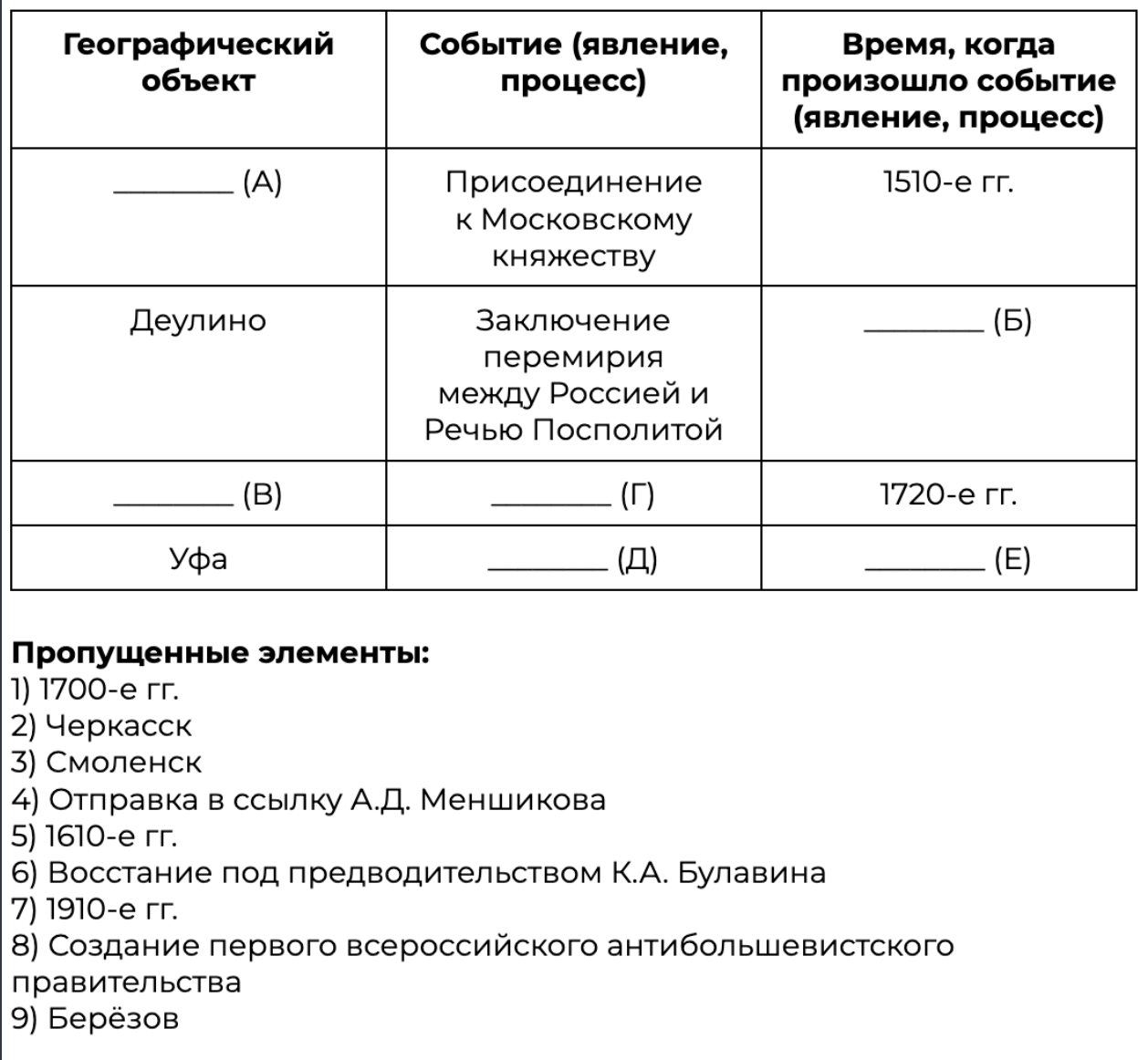 Заполните пустые ячейки таблицы, используя приведённый ниже список пропущенных элементов: для каждого пропуска, обозначенного буквой, выберите номер нужного элемента.