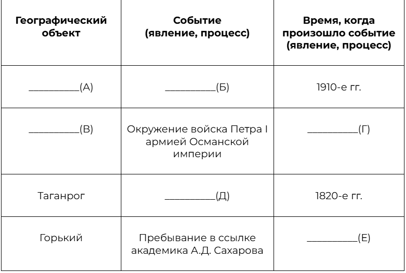 Заполните пустые ячейки таблицы, используя приведённый ниже список пропущенных элементов: для каждого пропуска, обозначенного буквой, выберите номер нужного элемента.
