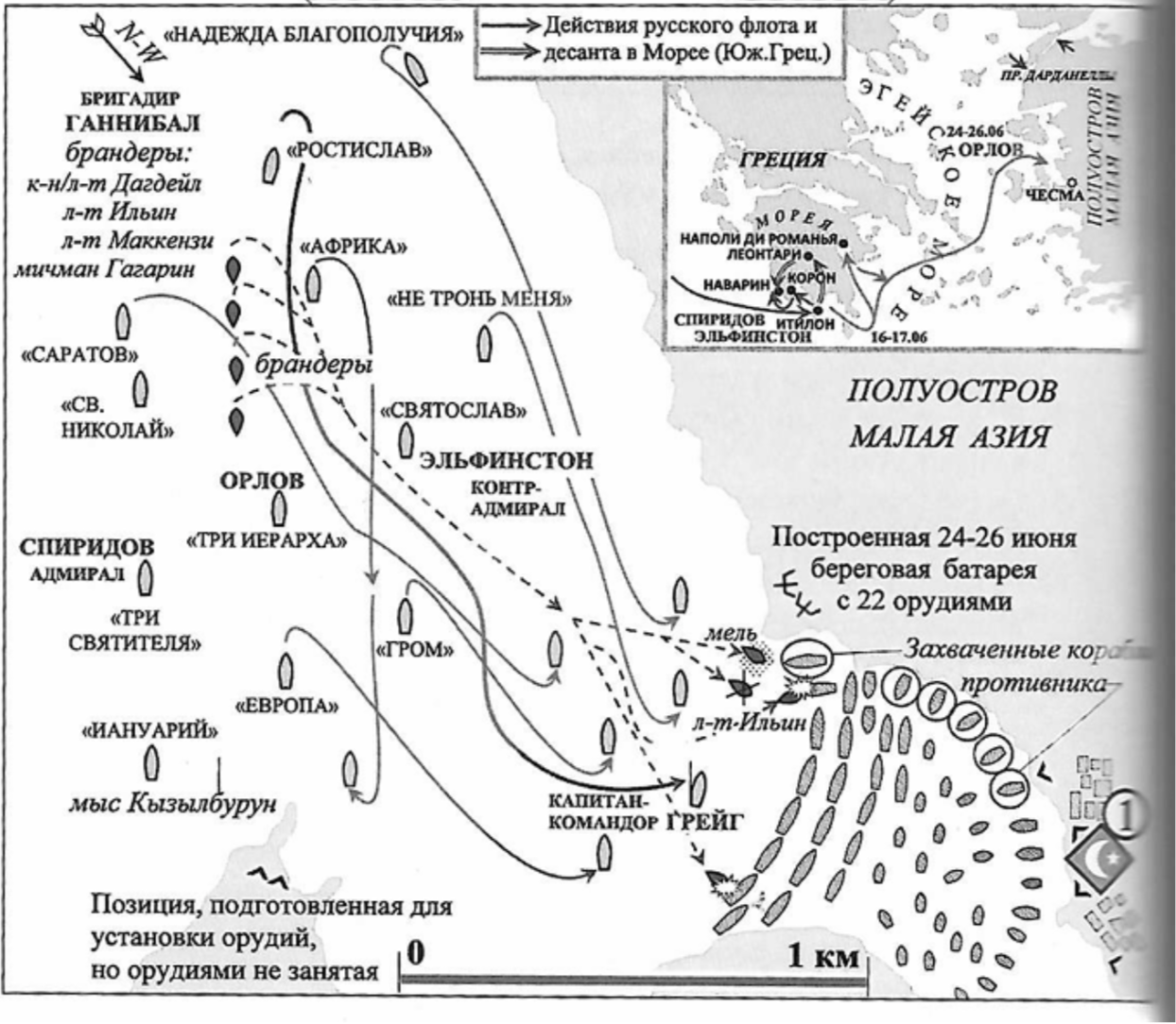 Укажите цифру, которой на схеме (или вставке к схеме) обозначен пункт, о котором адмирал Г. А. Спиридов писал в донесении: «Честь Всероссий- скому флоту! С 25 на 26 [июня] неприятельский военный флот… атаковали, разбили, разломали, сожгли, на небо пустили, потопили и в пепел обратили… а сами стали быть во всём архипелаге… господствующими».