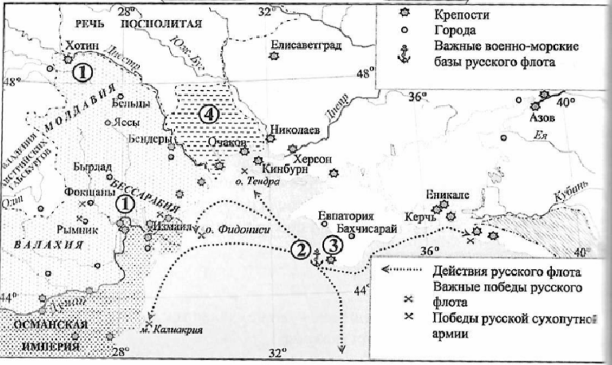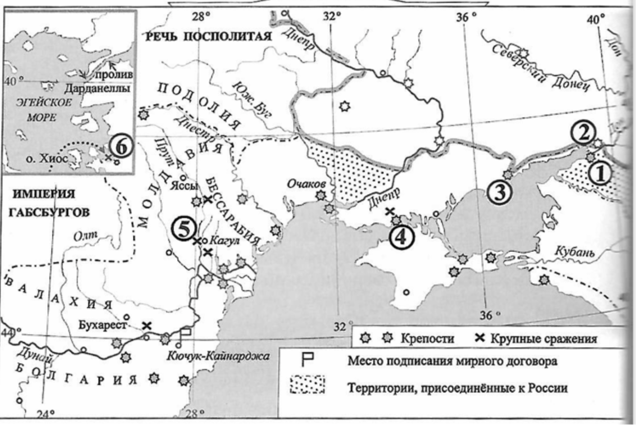 Укажите цифру, которой на схеме обозначена одна из баз русской армии - крепость Святого Димитрия Ростовского.
