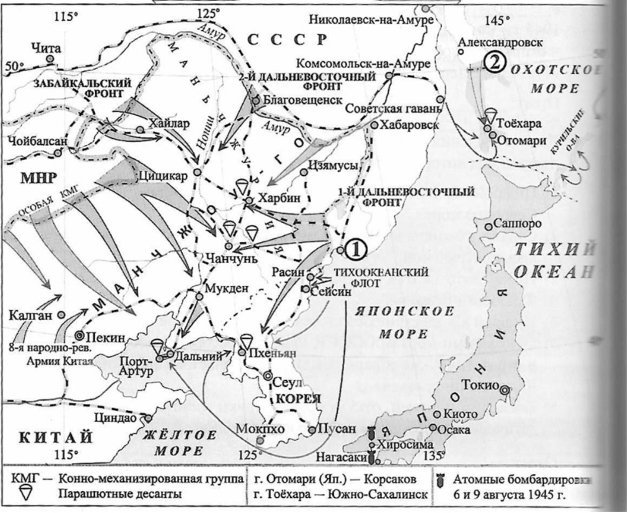 На схеме показаны направления ударов советских войск. Укажите название страны, с которой велась война.