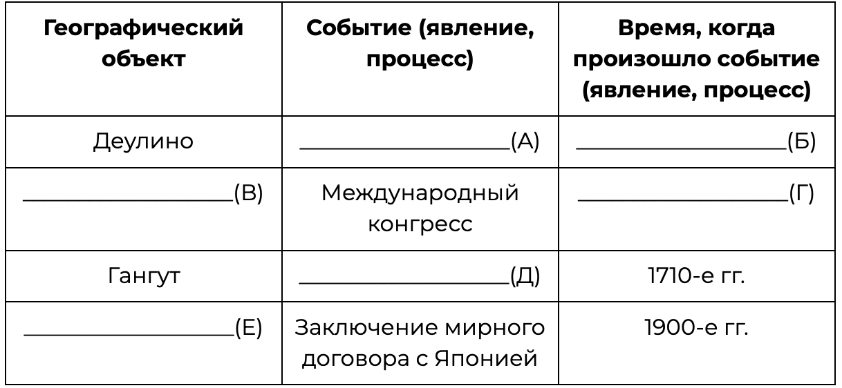 Заполните пустые ячейки таблицы, используя приведённый ниже список пропущенных элементов: для каждого пропуска, обозначенного буквой, выберите номер нужного элемента.