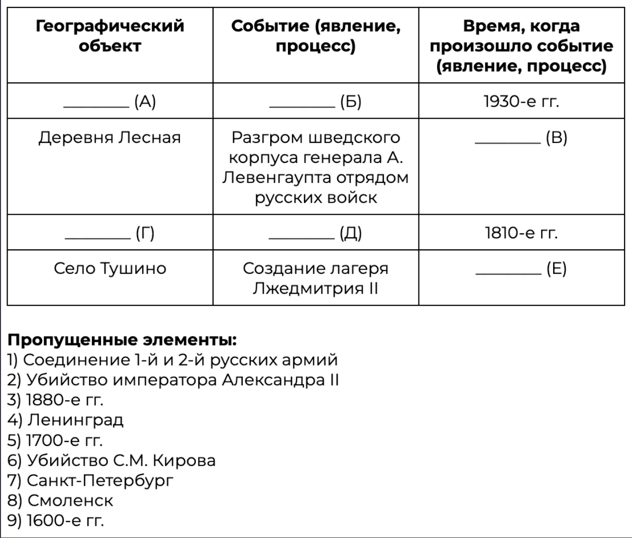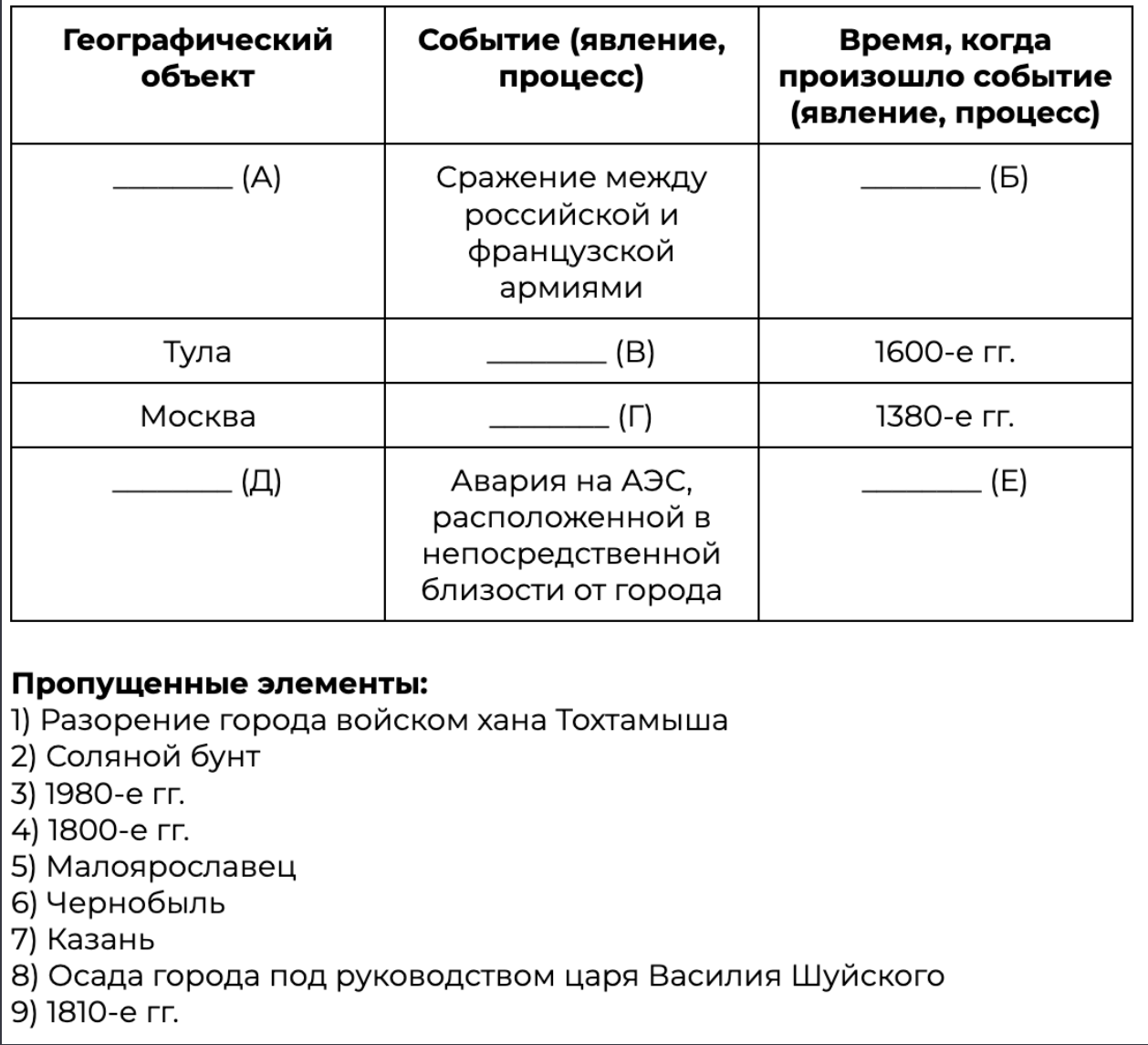 Заполните пустые ячейки таблицы, используя приведённый ниже список пропущенных элементов: для каждого пропуска, обозначенного буквой, выберите номер нужного элемента.
