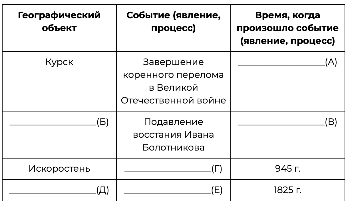 Заполните пустые ячейки таблицы, используя приведённый ниже список пропущенных элементов: для каждого пропуска, обозначенного буквой, выберите номер нужного элемента.
