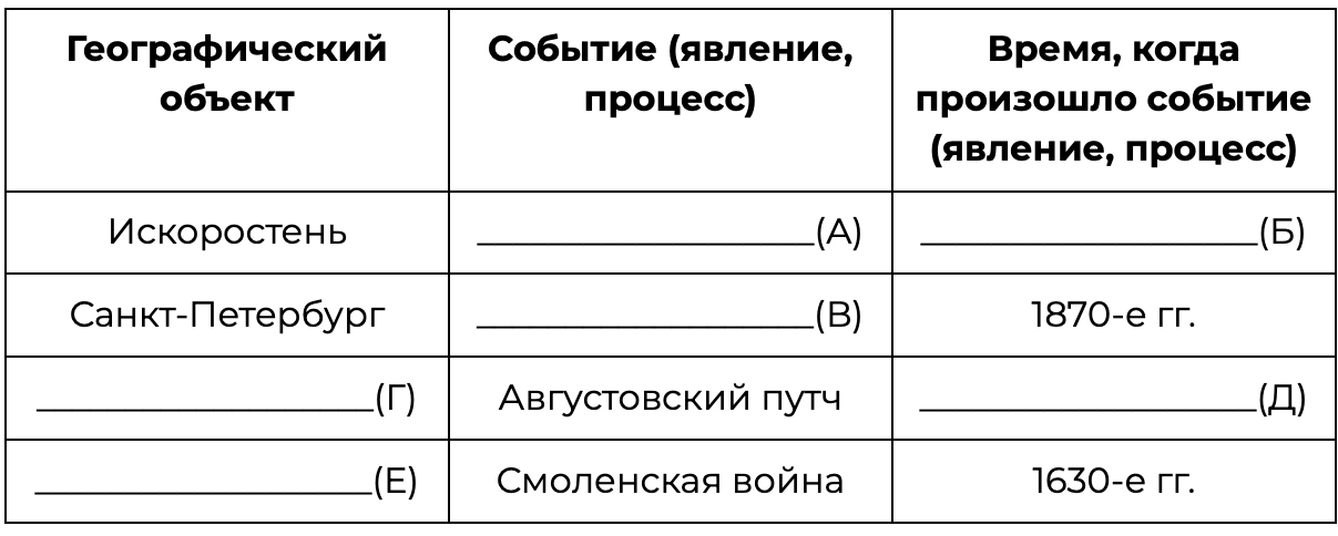 Заполните пустые ячейки таблицы, используя приведённый ниже список пропущенных элементов: для каждого пропуска, обозначенного буквой, выберите номер нужного элемента.