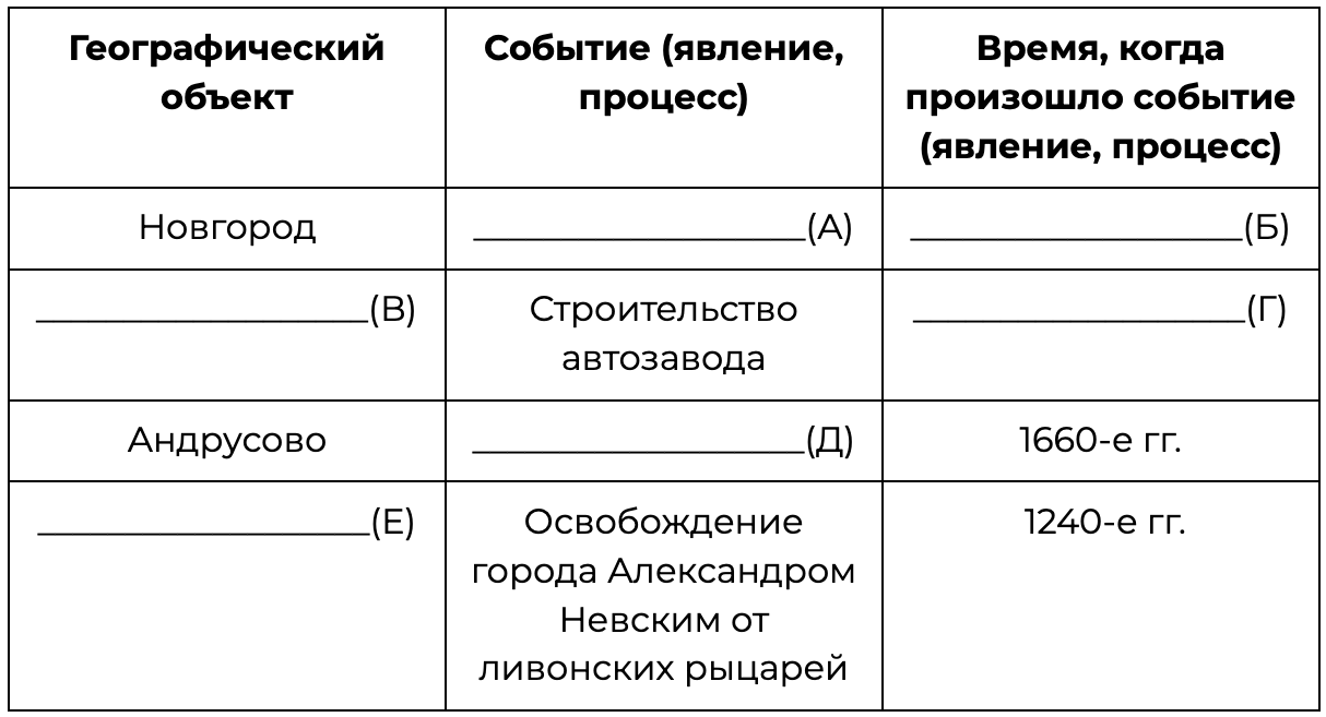 Заполните пустые ячейки таблицы, используя приведённый ниже список пропущенных элементов: для каждого пропуска, обозначенного буквой, выберите номер нужного элемента.