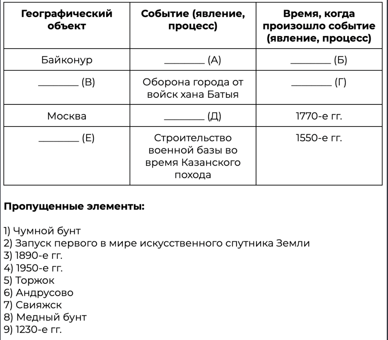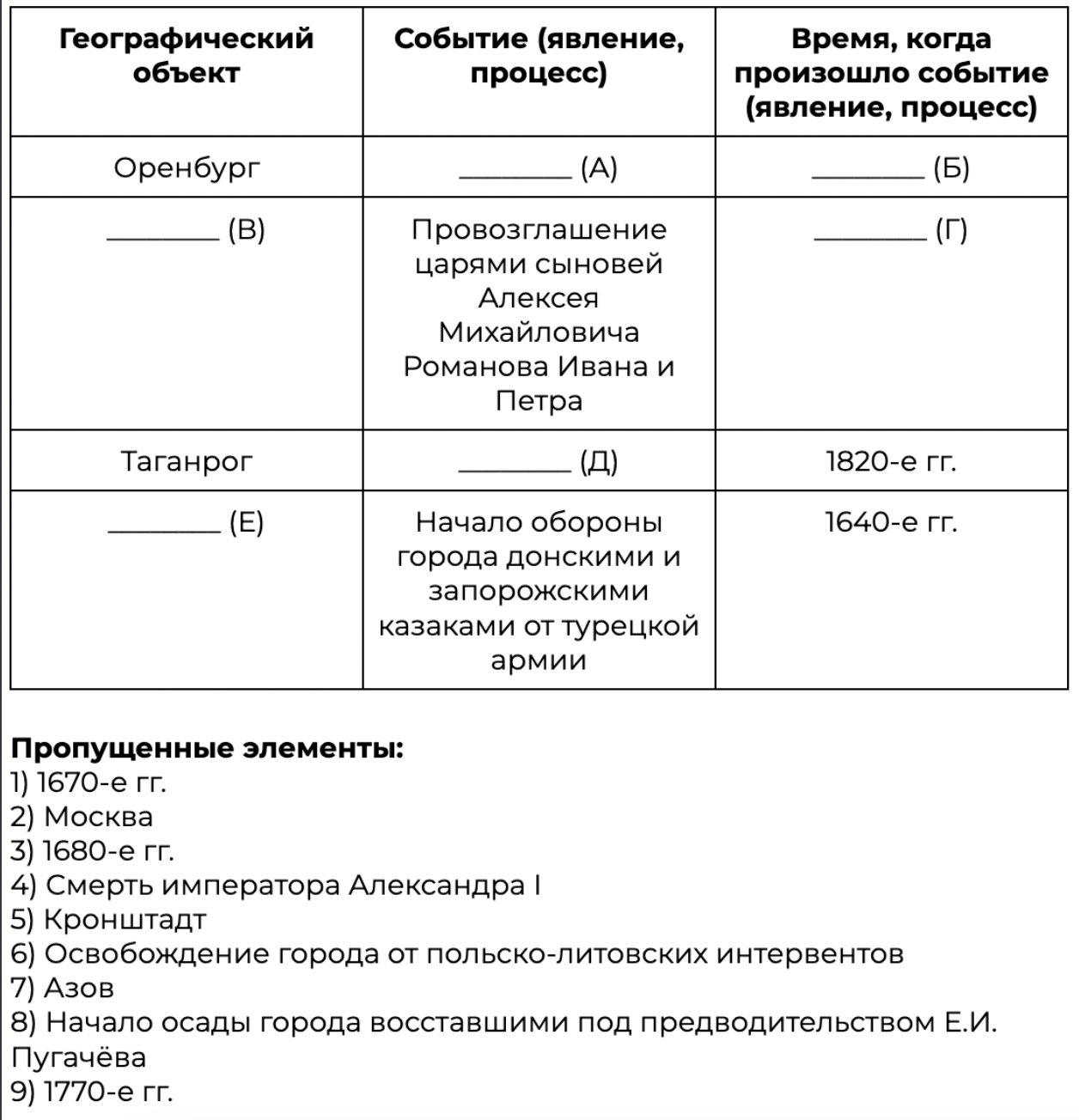 Заполните пустые ячейки таблицы, используя приведённый ниже список пропущенных элементов: для каждого пропуска, обозначенного буквой, выберите номер нужного элемента.