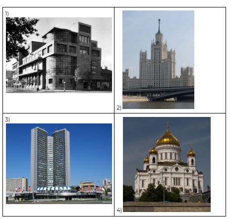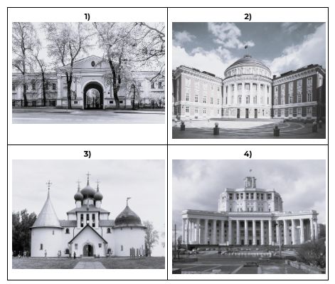 Какой из представленных ниже памятников архитектуры был создан при правителе, при котором происходило событие на марке? В ответе запишите цифру, которой обозначена картина. Укажите название архитектурного стиля, в котором построен памятник.