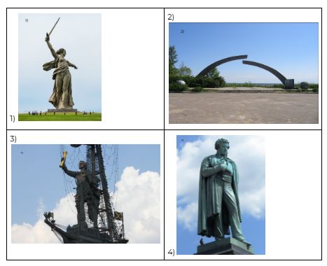 Какой из представленных ниже скульптурных памятников уже был создан в период, когда произошло событие, изображенное на марке? В ответе запишите цифру, которой обозначен этот скульптурный памятник. Укажите город, где находится этот памятник.