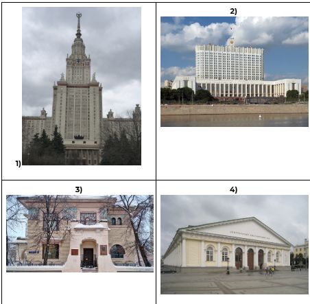 Какой из представленных ниже памятников архитектуры был создан в начале того же века, в который произошло событие, отраженное на марке? В ответе запишите цифру, которой обозначена картина. Укажите название архитектурного стиля, в котором построен памятник.