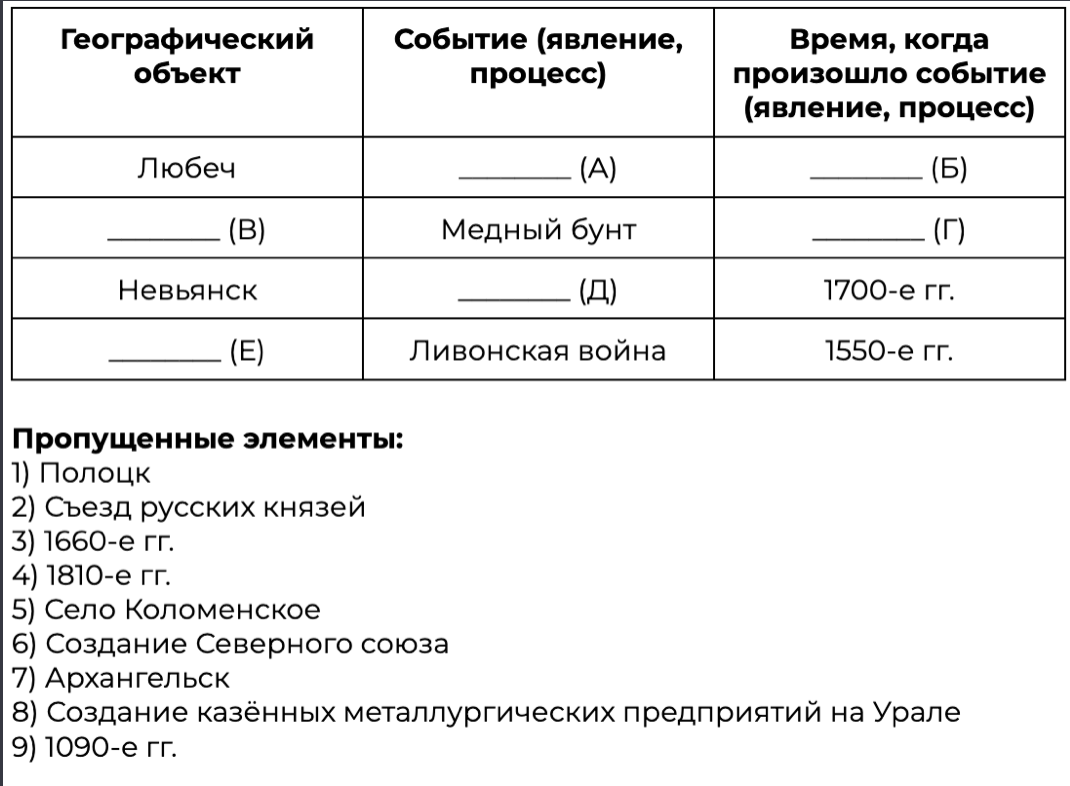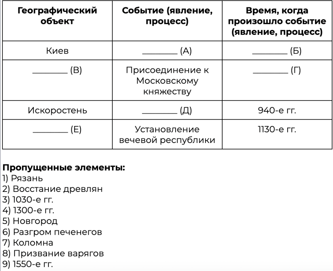 Заполните пустые ячейки таблицы, используя приведённый ниже список пропущенных элементов: для каждого пропуска, обозначенного буквой, выберите номер нужного элемента.