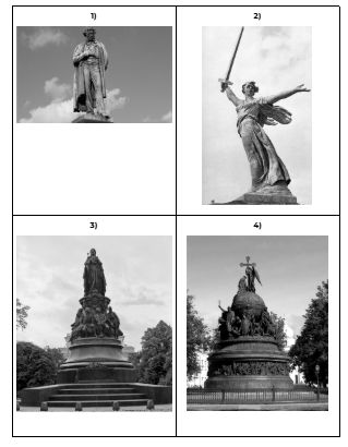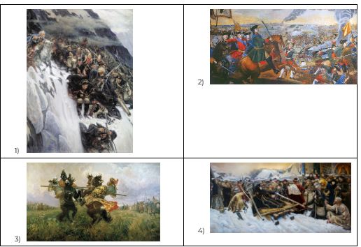 Какое из произведений живописи посвящено событию, произошедшему в том же веке, когда был основан город, к юбилею которого была выпущена марка. В ответе запишите цифру, которой обозначен это произведение живописи. Укажите название творческого объединения, в которое входил автор данной картины.