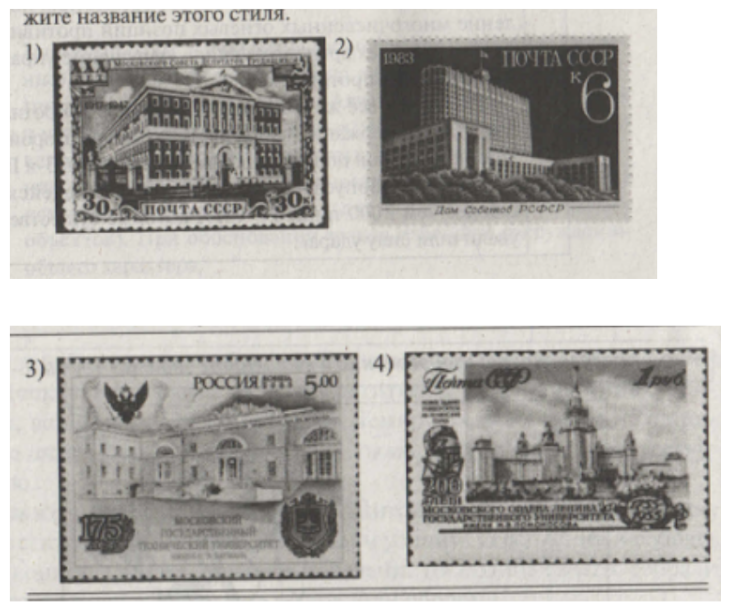 Какой из представленных ниже на марках памятник архитектуры является частью архитектурного стиля, получившего название от фамилии руководителя ВКП(б) периода, отражённого на плакате в предыдущем задании. В ответе запишите цифру, которой обозначен этот памятник архитектуры. Укажите название этого стиля.