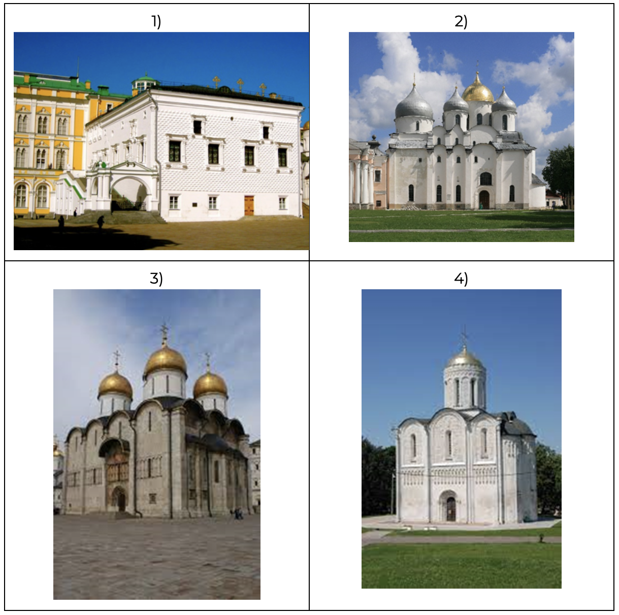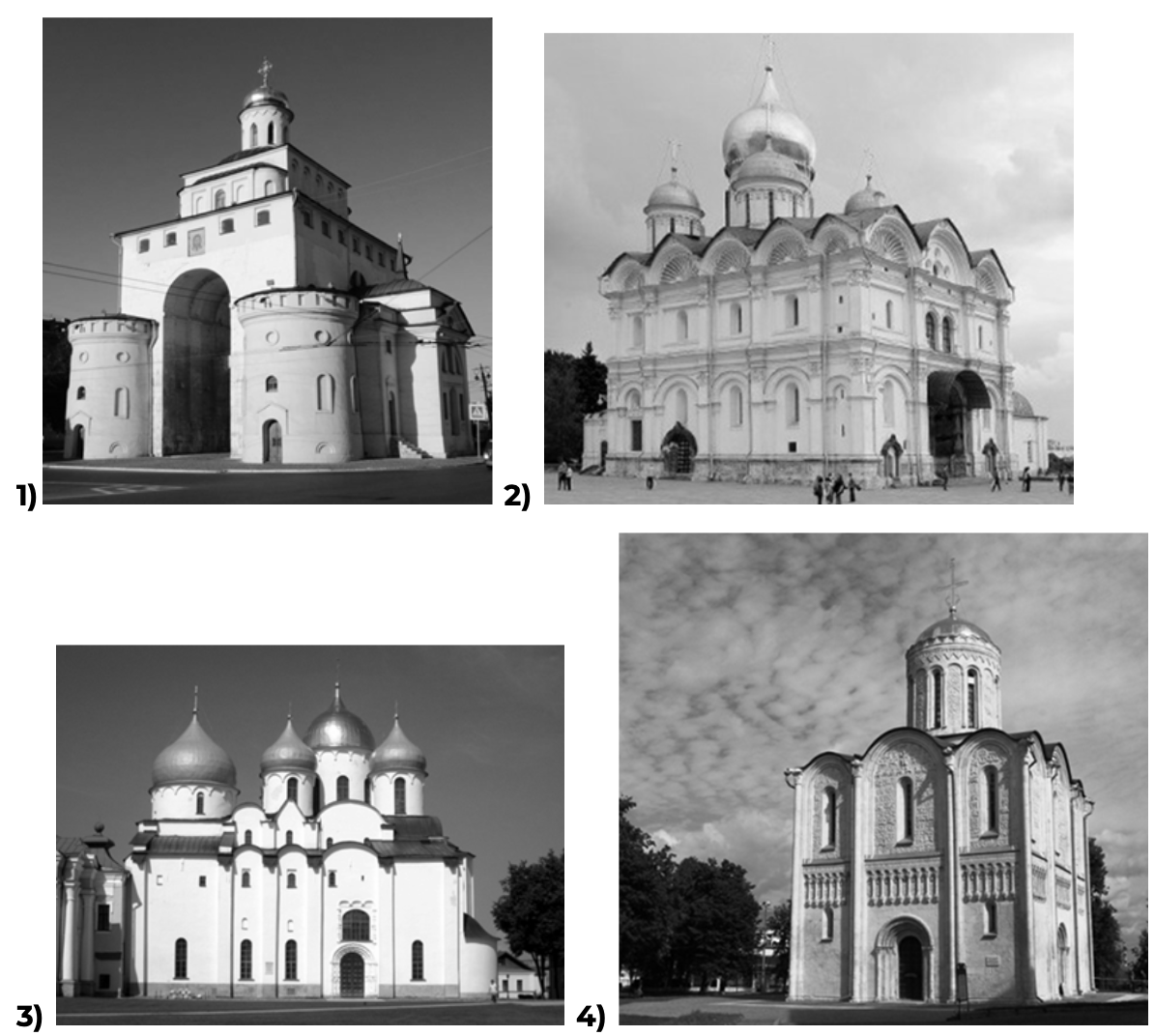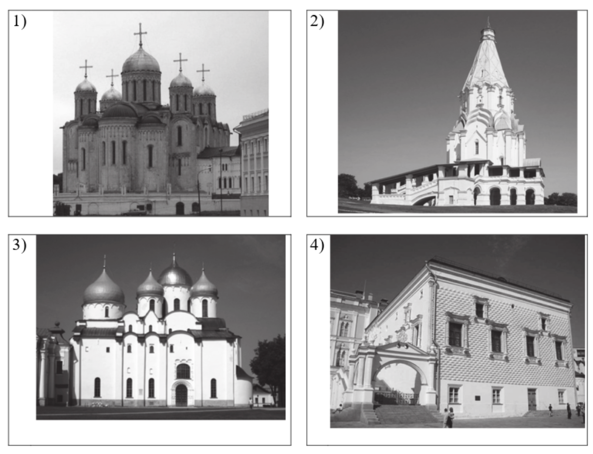 Какой из представленных ниже памятников архитектуры был создан в период, правления сына князя, изображенного на монете? В ответе запишите цифру, которой обозначен этот памятник архитектуры. Укажите город, где находится этот памятник архитектуры.