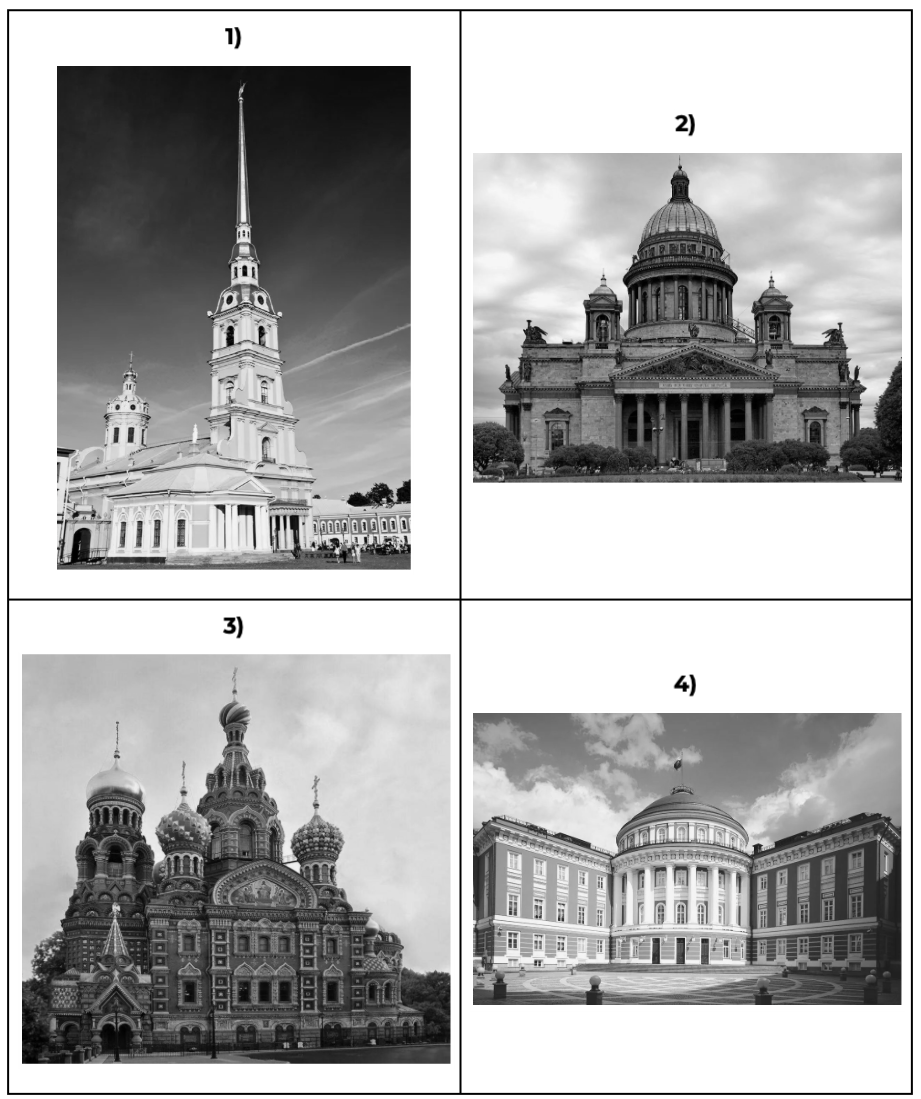 Какой из представленных ниже памятников архитектуры был создан после события, юбилею которого посвящён почтовый блок? В ответе запишите цифру. Назовите город, где находится этот памятник архитектуры.