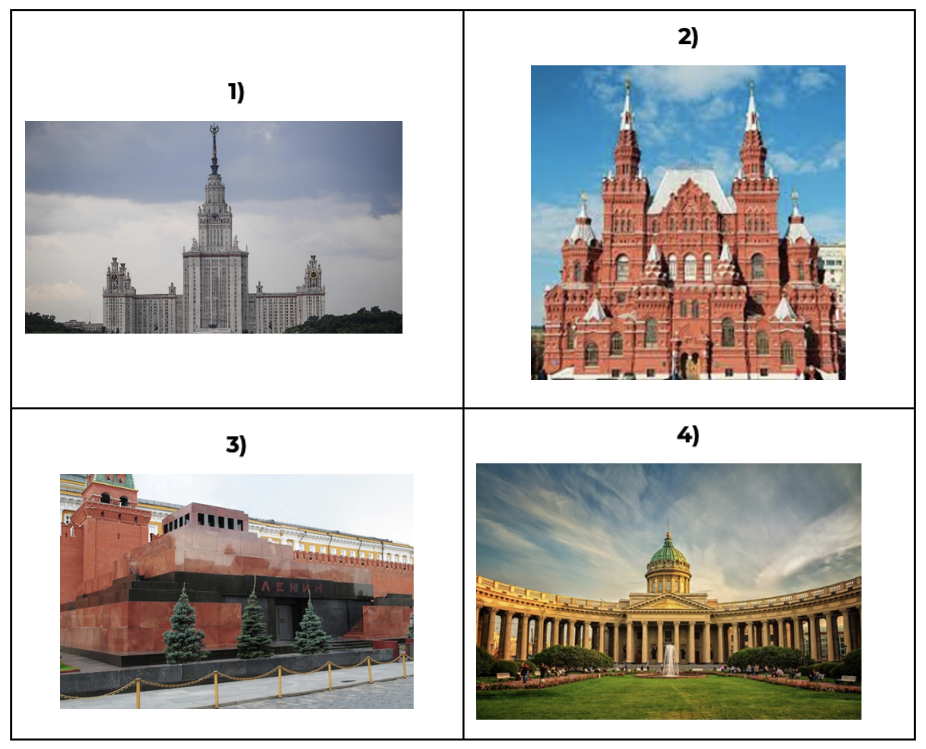 Какой из представленных ниже памятников архитектуры еще не был создан в период, когда была выпущена данная марка? В ответе запишите цифру, которой обозначен этот памятник архитектуры. Укажите город, где находится этот памятник архитектуры.