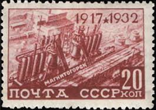 Укажите название государственной политики в сфере развития промышленности, которую символизирует изображение на данной марке. Используя изображение, приведите одно любое обоснование вашего ответа.