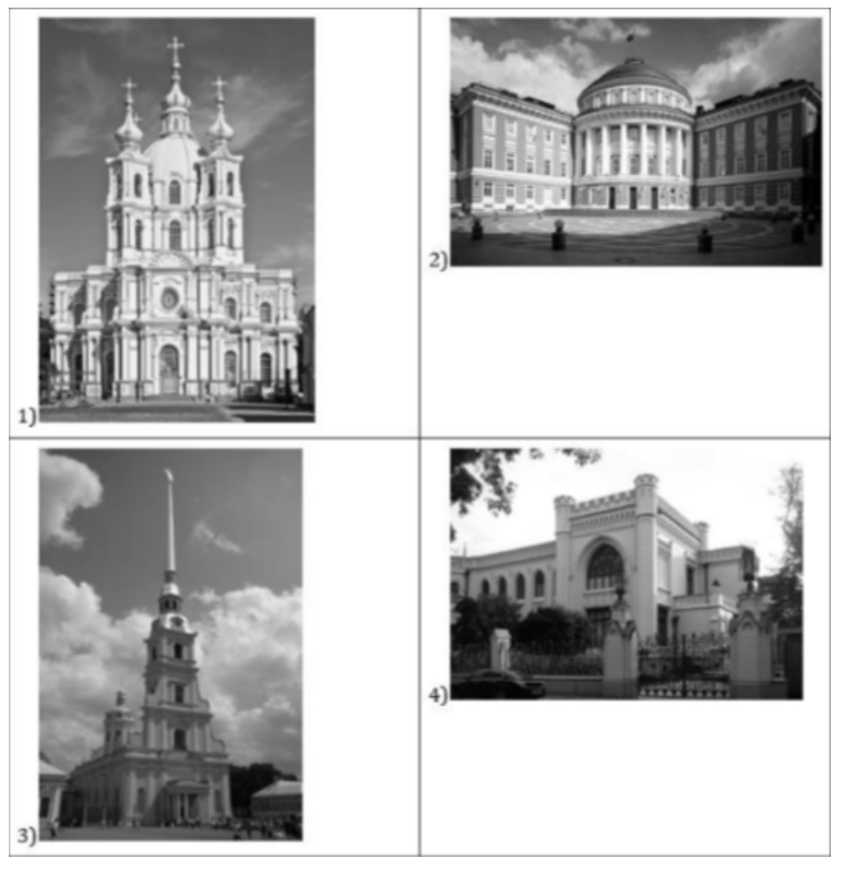 Укажите памятник архитектуры, построенный в том же стиле, что и здание, изображенное на медали. В ответ запишите цифру, под которой указан этот памятник архитектуры. Укажите название стиля данного памятника архитектуры.