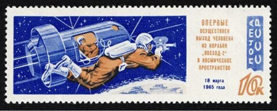 Укажите космонавта, изображенного на марке на переднем плане. Используя изображение, приведите одно любое обоснование вашего ответа.