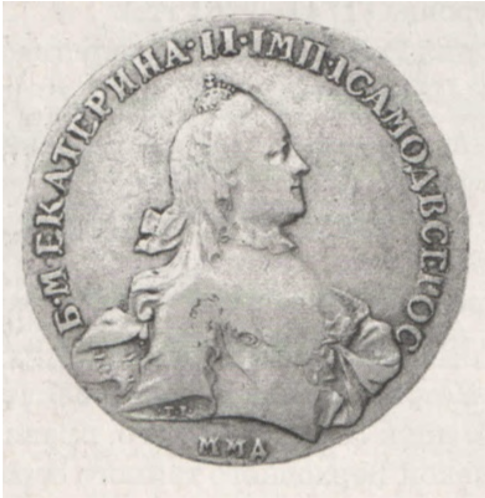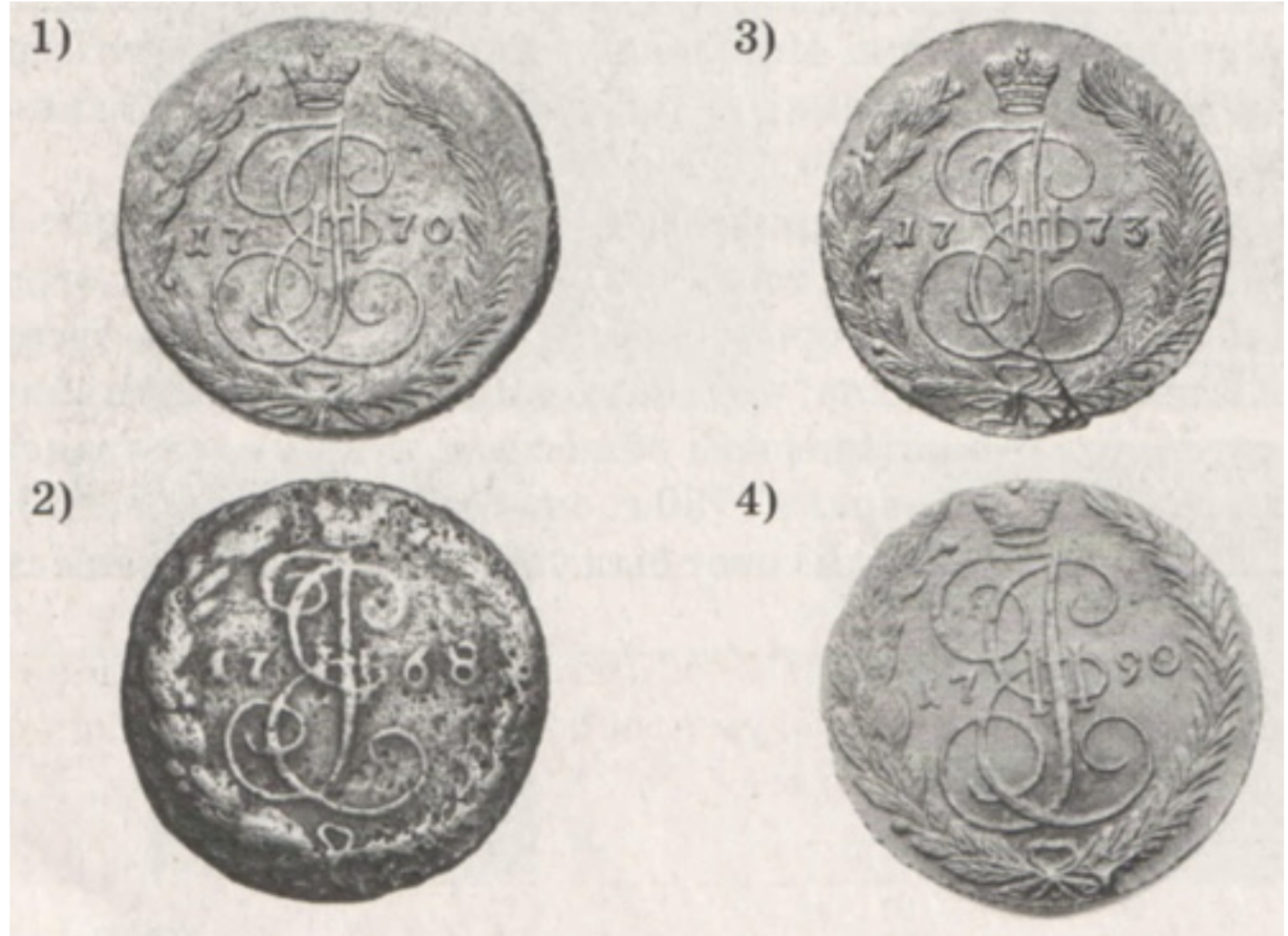 Какая из представленных монет была отчеканена в том же году, когда началось народное восстание на реке Яик? В ответе запишите цифру, которой обозначена эта монета. Укажите фамилию человека, возглавившего это народное восстание.