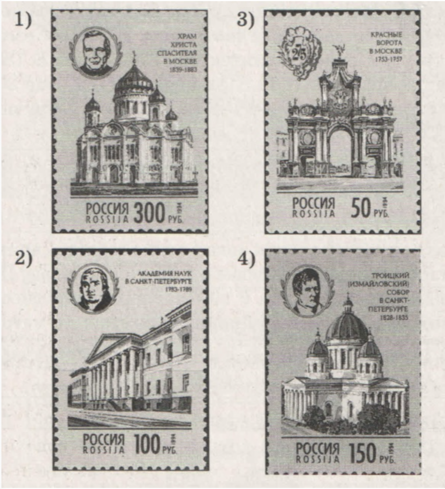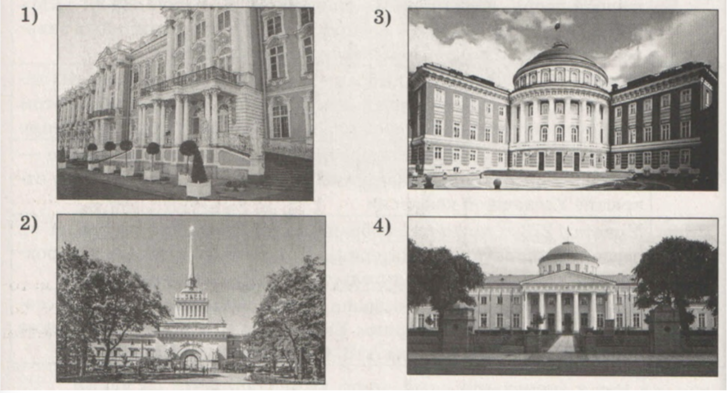 Какой из представленных ниже памятников архитектуры - резиденция монархов, созданная в том же веке, когда произошло событие, которому посвящена данная марка? В ответе запишите цифру, которой обозначен этот памятник архитектуры. Укажите название населенного пункта, где находится этот памятник архитектуры.