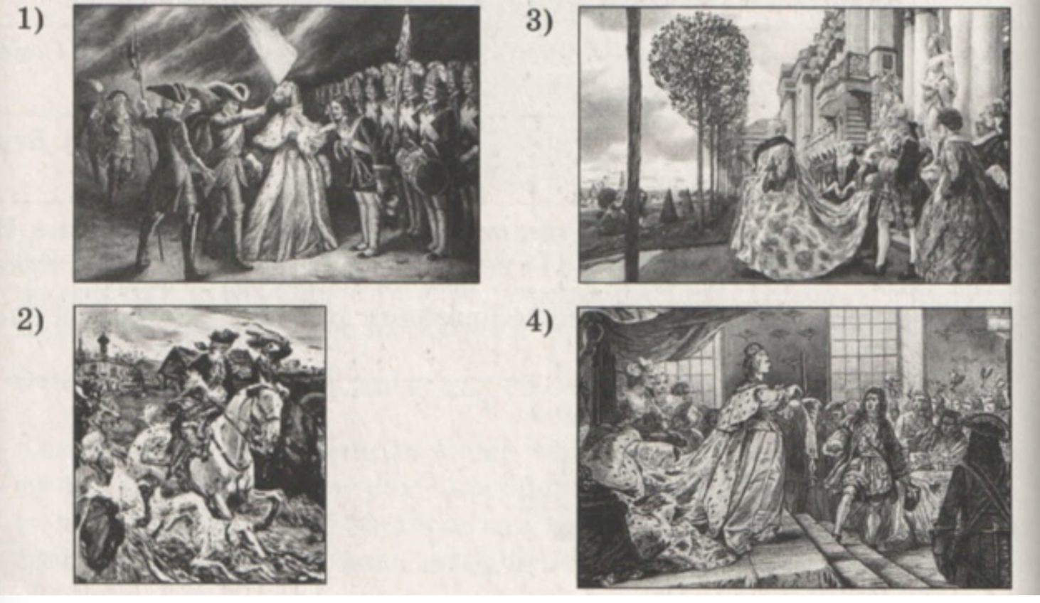 На какой из представленных иллюстраций изображена ситуация, связанная с воцарением двоюродной сестры императрицы Елизаветы Анны Иоанновны? В ответе запишите цифру, которой обозначена эта иллюстрация. Укажите название документа, которым Верховный тайный совет пытался ограничить власть этой императрицы.